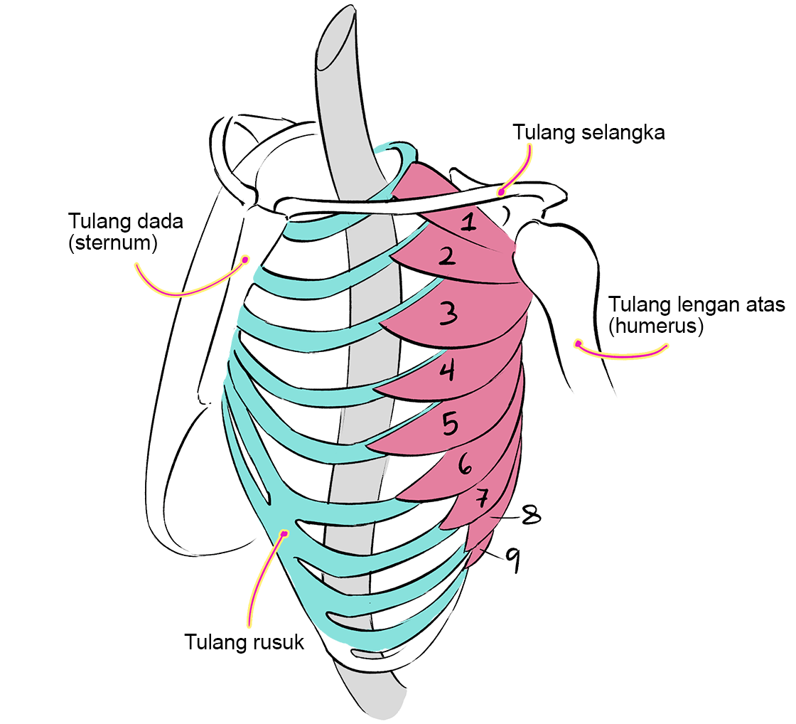Otot Serratus anterior berasal dari sembilan tulang rusuk atas dan melekat pada skapula, memberikan stabilitas dan mobilitas pada tulang tersebut. Otot ini memiliki bentuk seperti kipas, tetapi kita hanya dapat melihat sebagian karena tertutup oleh otot pektoralis, oblik, dan dorsal.