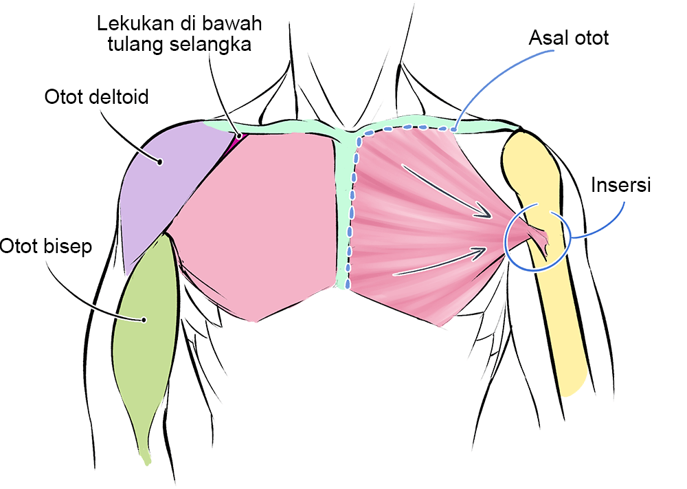 Otot dada terbentang di antara tulang selangka dan tulang dada, dengan ujungnya melekat pada humerus untuk memungkinkan lengan berputar (salah satu fungsinya).