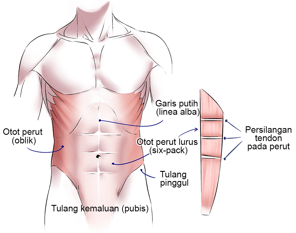 Di tengah, kita dapat menemukan otot rektus abdominis, yang berada di bawah lengkung tulang rusuk hingga ke pubis. Otot ini memiliki 3 persimpangan yang memisahkan otot menjadi 4 area di setiap sisi.