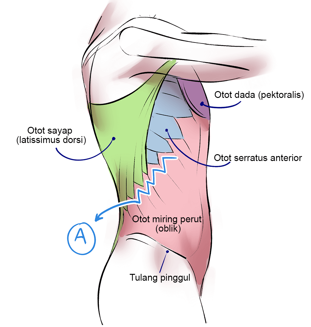 Tampilan samping ini memperlihatkan bagaimana otot-otot (dorsal, oblik, dan serratus anterior) saling terjalin untuk membentuk garis zig-zag (A).