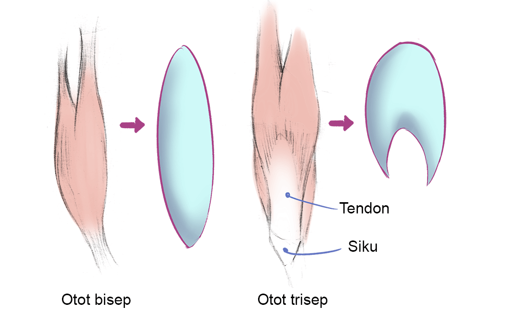 Untuk menyederhanakan bisep, gambarlah oval yang memanjang. Anda bisa membayangkan bagian yang lebih tebal dari trisep sebagai bentuk tapal kuda… atau croissant, atau bulan sabit! Bagian datar dari trisep (tendon) terhubung dengan siku.