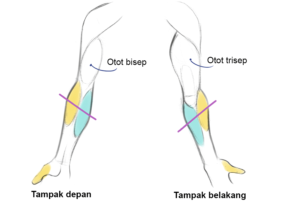 Ada banyak cara untuk menginterpretasikan otot, dan tidak apa-apa menggunakan metode yang mudah untuk dipahami. Pada akhirnya, semua tergantung pada pengamatan dan praktik untuk dapat menggambar dengan akurat. Misalnya, kita bisa menggambarkan siluet lengan bawah dengan sepasang oval. Karena asimetri lengan bawah, oval di sisi yang sama dengan ibu jari sedikit lebih kecil dan terletak sedikit di atas oval lainnya.