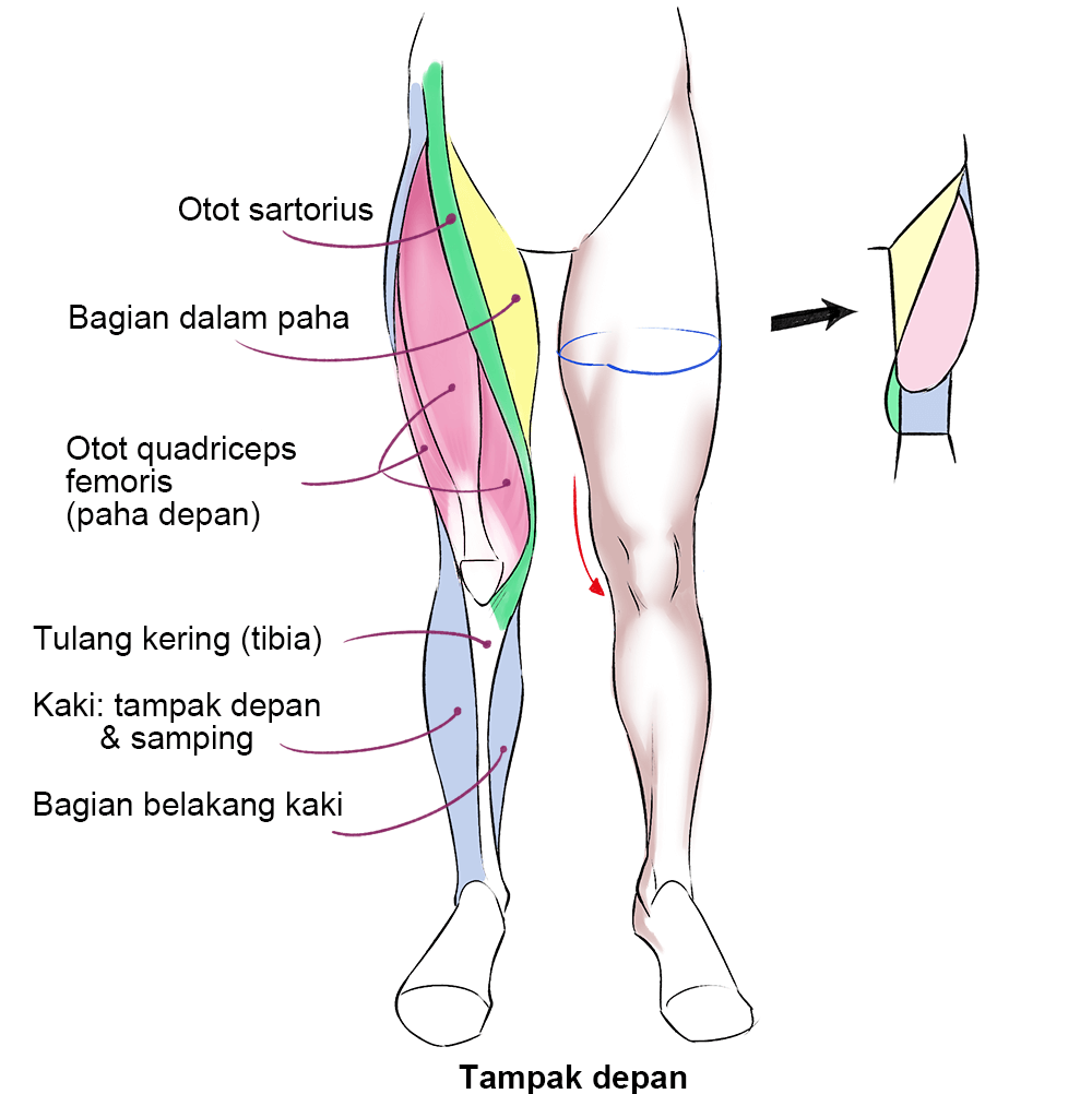 Otot sartorius membagi kaki dengan garis diagonal. Dimulai dari sakrum hingga sisi dalam tulang kering (sedikit di bawah lutut), ini adalah otot terpanjang di tubuh manusia. Paha bagian dalam terdiri dari beberapa otot adduktor, tetapi Anda dapat mengelompokkan semuanya dan menganggapnya sebagai sebuah segitiga.