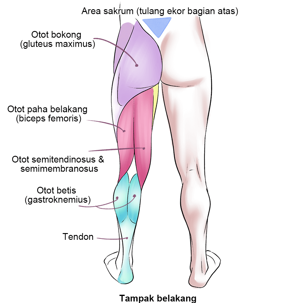 Saya telah mengelompokkan bisep femoris, semitendinosus, dan semimembranosus sebagai satu bentuk di sepanjang paha. Bentuk ini terbagi menjadi dua, meninggalkan cekungan berbentuk berlian di belakang lutut.