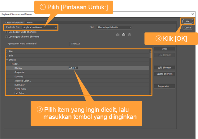 Dari dialog Pintasan Keyboard dan Menu, atur tombol pintasan sesuai kebutuhan Anda untuk berbagai perintah dan alat.