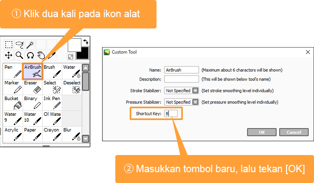 Untuk mengatur tombol pintasan alat, klik dua kali alat yang ingin Anda sesuaikan untuk membuka kotak dialog Custom Tool Settings. Masukkan tombol di bidang Shortcut Key, dan tekan OK untuk mengonfirmasi.