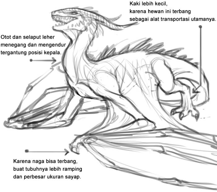 Anda mungkin tidak akan mendapatkan hasil yang diinginkan, jika tidak memahami struktur otot dan tulang. Memahami bagaimana lengan dan kaki bergerak, serta bagaimana tulang bisa memberikan tepi yang tajam, akan membantu Anda menciptakan naga yang terlihat lebih menarik. Imajinasi dan visi sangat penting, tetapi hanya bisa bertahan sampai batas tertentu sebelum semuanya menjadi terlalu tidak masuk akal.