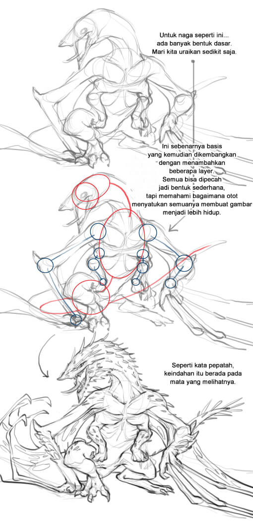 Saya suka membayangkan ini seolah-olah saya sedang membuat monster mirip manusia dengan banyak anggota tubuh. Naga perlu memiliki otot dan tendon untuk menggerakkan sayapnya … jangan ragu bereksperimen dengan ide-ide Anda sendiri, dan Anda mungkin akan terkejut dengan hasilnya.