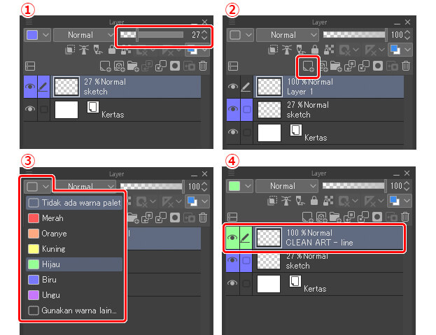 Sekarang setelah gambar kita siap, kita perlu membersihkan hasil kerja kita. Untuk melakukannya, pertama turunkan opasitas layer sketsa agar tidak mengganggu — sekitar 20-30% sudah cukup (1). Kemudian buat layer baru dengan mengklik tombol yang ditunjukkan dalam gambar (2). Salah satu trik untuk mengorganisir adalah memberi setiap layer warna tertentu agar Anda bisa dengan cepat membedakannya (3). Terakhir, klik kanan dan ubah nama layer baru menjadi “clean art,” supaya Anda tahu di mana garis bersih Anda akan diletakkan (4).
