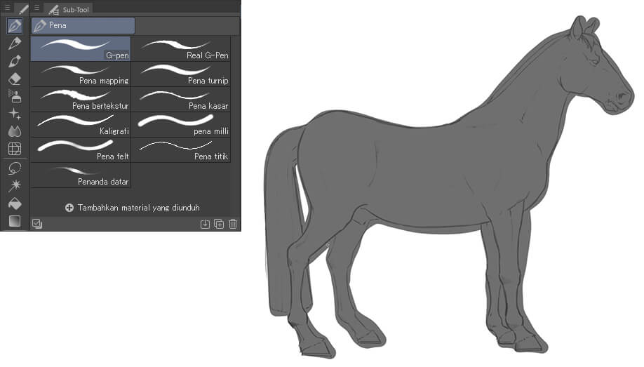 Dengan menggunakan alat GPen dan warna abu-abu tengah, kita mulai mewarnai gambar kuda.