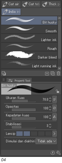 Jika Anda ingin menambah lebih banyak kedalaman dan pilihan untuk menunjukkan cahaya dan volume, baiknya tambahkan satu atau dua nuansa abu-abu ke dalam komposisi. Ini mengurangi kontras antara hitam dan putih murni serta menciptakan area yang nyaman untuk mata. Dalam komposisi ini, kita akan menggunakan kuas bernama “Bit Husky” dari kategori Tinta India (shortcut “b”) dengan pengaturan standar (Gambar 04).