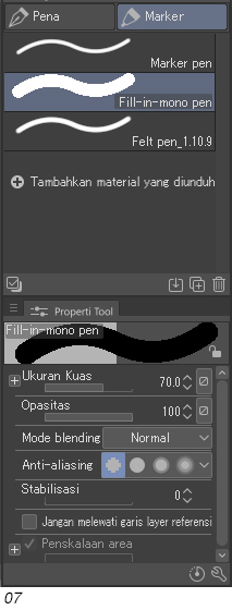 Kita akan mencoba mengurai bentuk kepala menjadi bentuk-bentuk yang lebih sederhana, tanpa terlalu memperhatikan detail, untuk memahami hal-hal dasar yang membantu kita mengetahui seperti apa bentuk kepala. Dalam latihan ini, kita akan memilih kategori Pena (shortcut “p”) dan memilih Penanda (Gambar 07). Tapi, kita akan membuat beberapa perubahan dan kustomisasi agar mendapatkan hasil yang lebih baik.