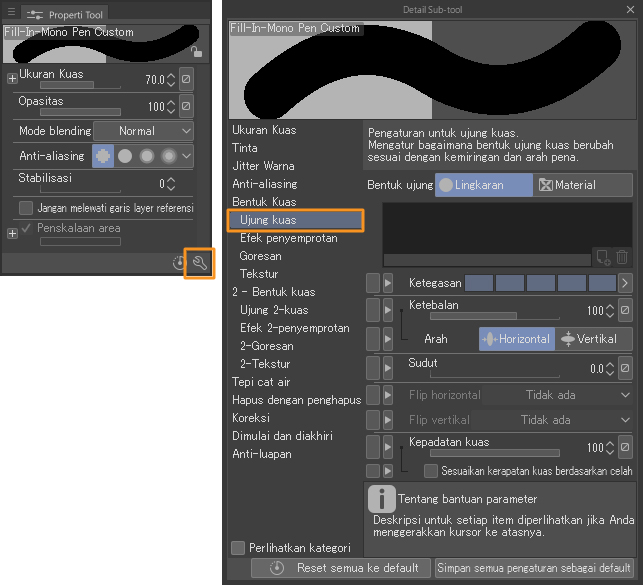 Kita akan mulai dengan “Pena Fill-In-Mono.” Klik kanan pada objek dan pilih “Duplikasikan Sub-Tool,” kemudian ganti namanya (di sini saya menamainya “Fill-In-Mono Pen Custom”). Klik ikon pengaturan (pojok kanan bawah) dan kustomisasikan Penanda di menu “Ujung Kuas” dengan pengaturan berikut (Gambar 08):