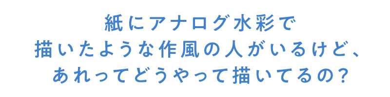 [筆]ツールにある[水彩]グループのブラシは、紙に水彩絵の具を塗ったようなタッチを出せます。描き味やブラシの形、紙質などを細かく調整できるので、塗り方や設定のコツを覚えて、表現の幅をひろげましょう!