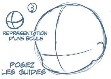 Comme mentionné précédemment, afin de garder une impression de « sphère », il ne faut pas tracer les bases droites, mais courbées, en particulier pour les dessins de visages vu à 45 degrés. Je pense que pour vous aider, vous pouvez imaginer un globe terrestre avec ses lignes longitudinales et latitudinales. Étant donné que les yeux d’un mini-personnage recouvrent une grande partie du visage, il faut tracer le repère horizontal légèrement vers le bas.