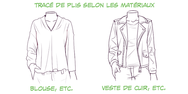 Dessiner les vêtements délicats tels que les blouses, T-shirt avec un pinceau fin et les vêtements plus lourds tels que les vestes de cuir avec un pinceau plus large permettent la compréhension immédiate des matériaux !