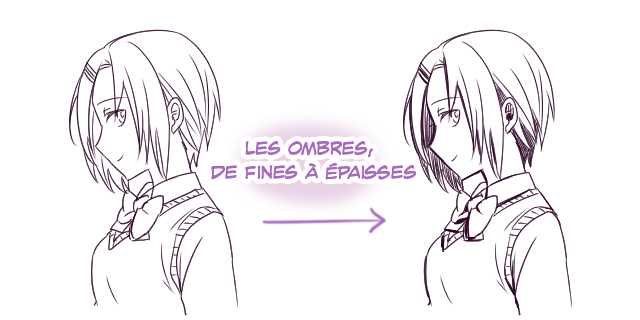Lorsque vous peignez les couleurs d’une illustration, vous dessinez des ombres foncées et des éclats pâles n’est-ce pas ? Il va de même avec le dessin au trait ; vous pouvez créer de la tridimensionnalité en traçant des contours épais pour les parties sombres et des traits plus fins pour les parties illuminées.