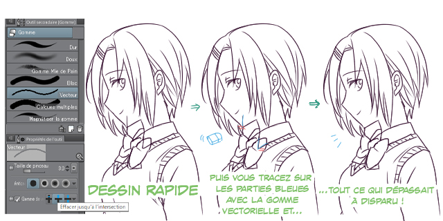 Lorsque vous supprimez les lignes inutiles d’un dessin couvert d’un calque vecteur, vous devez faire attention pour ne pas supprimer également les traits que vous voulez conserver. Nous vous conseillons d’utiliser l’outil [Gomme] sur le mode [Vecteur] pour effacer sans risque ce que vous voulez voir disparaître.
