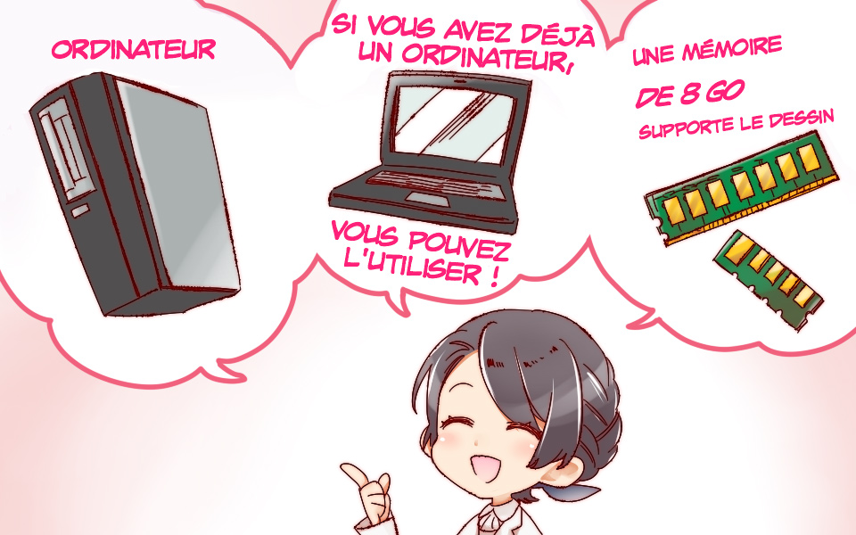 Il n’y a pas de problème à utiliser l’ordinateur que vous possédez déjà. Vous pouvez également dessiner des illustrations avec un ordinateur portable. Si son utilisation devient lourde, lente ou encore si l’écran fige, vous devez envisager l’ajout ou le remplacement de la mémoire.