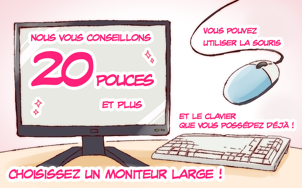 Si vous planifiez en acheter un nouveau, nous vous recommandons d’opter pour un grand écran afin de dessiner plus facilement. Nous vous conseillons un écran de 20 pouces et plus.