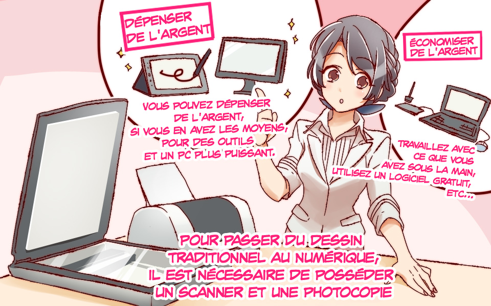 Aucun appareil supplémentaire n’est nécessaire, à l’exception d’un scanner si vous pensez dessiner vos bases et vos esquisses à la main. Si vous importez votre base sur votre ordinateur, vous pouvez y effectuer l’encrage et la colorisation. Vous pouvez également convertir en tant que matériaux toutes textures ou couleurs dessinées à la main si vous en importez les données. De plus, vous devez vous procurer une imprimante si vous désirez imprimer vos illustrations une fois terminées.