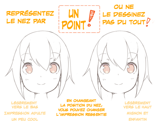 Je pense que la plupart des gens le savent, mais le mieux pour dessiner un nez mignon, est de le représenter par un point ou de ne pas le dessiner du tout !
