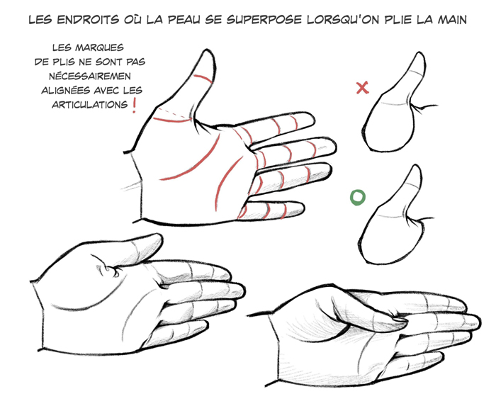 Pour que les doigts puissent se plier, la peau est relativement fine et souple au niveau des articulations. Cependant, les marques de plis sur la paume de la main ne sont pas nécessairement alignées avec les articulations. Bien que ces lignes n’apparaissent pas dans certains styles de dessin, il est important de savoir où elles se trouvent et où la peau se superpose pour pouvoir dessiner de jolis doigts pliés.