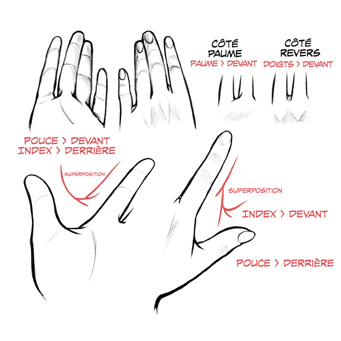 Il est facile de se tromper lorsque l’on dessine la base des formes d’une main, car elles ne sont pas parfaitement carrées ou parallèles. Lorsque les doigts sont écartés, ils pointent tous vers une direction différente. Puisque le point d’origine, ainsi que la longueur des doigts sont différents, les articulations ne sont pas alignées en ligne droite.