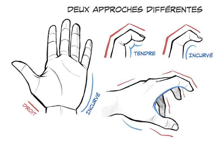 Séparer les formes de la main en différentes parties avec des lignes droites et des courbes peut rendre le mouvement de celle-ci plus dynamique et expressive. Plus vous observez la paume d’une main, plus ses formes paraissent douces. Cela varie parfois en fonction de l’angle et de la forme de la main.