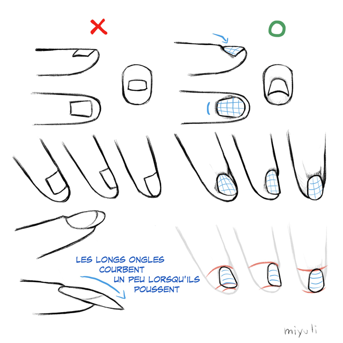 Des orteils ou des doigts alignés peuvent être dessinés sous forme d’arc, ce qui rend la forme plus claire et frappante. Veillez à souligner la forme autant que possible.