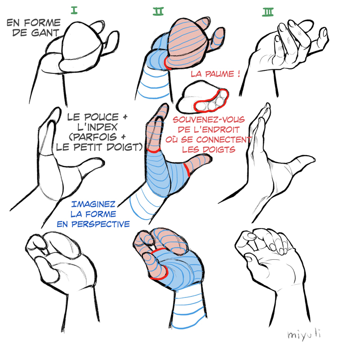 Lorsque vous dessinez des mains, commencez par une forme de gant très simple et dont la perspective est facile à imaginer. Il est facile de se sentir perdu si on se concentre soudainement sur les différents détails de la main, donc revenez-y plus tard. Quel que soit votre style de dessin, il est préférable de commencer en toute simplicité. De cette façon, vous pouvez créer des mains à la silhouette plus convaincante sans vous laisser influencer par les petits détails. Une fois cette étape terminée, vous pouvez appliquer vos connaissances sur la perspective et l’anatomie et chercher des références. Utilisez un miroir ou un appareil photo pour observer vos propres mains ; c’est la meilleure référence disponible !