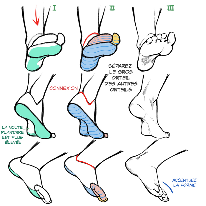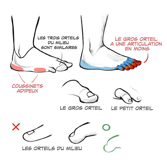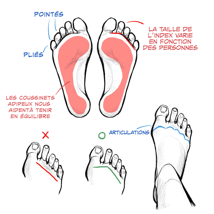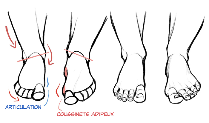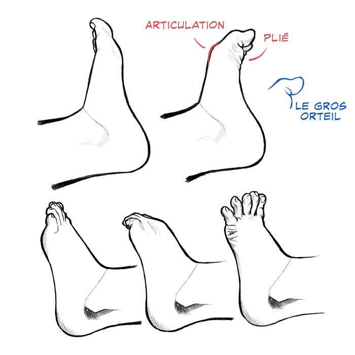 Tout comme avec les mains, il est recommandé de décomposer les pieds dans de simples formes. Le mouvement des pieds est plus limité que celui des mains, car ils sont principalement utilisés pour se tenir debout et marcher. Le gros orteil peut être vu différemment des autres orteils afin de pouvoir trouver une pose plus dynamique. Dessiner la plante des pieds peut être un peu difficile sous certains angles. La voûte plantaire touche à peine le sol, car elle n’est pas aussi charnue que la plante des pieds.