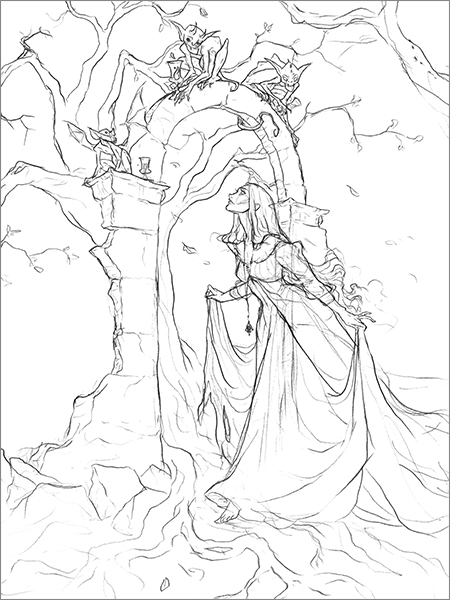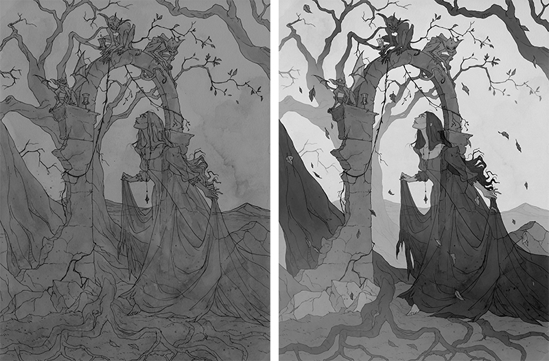 Pendant que je réfléchis encore, je fais des recherches pour certains des détails de la pièce, tels que l’arche en ruine et la robe dramatique du sujet principal. J’aime aussi chercher des images qui évoquent un sentiment similaire à celui que je veux obtenir dans ma propre pièce. J’adore l’esthétique sombre, gothique et fantastique, donc les draperies dramatiques et les poses élégantes sont très importantes dans mon travail. Je suis fortement inspirée par les illustrateurs de « l’Âge d’Or », tels qu’Arthur Rackham, Edmund Dulac, John Bauer et Ida Rentoul Outhwaite. J’aime le sens du jeu et de l’élégance dans leurs pièces, en particulier lorsqu’il est combiné avec des sujets plus sombres, tels que les sorcières et les monstres de contes de fées.