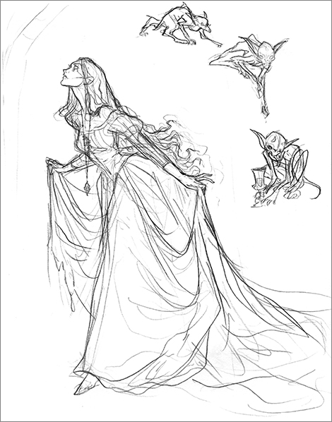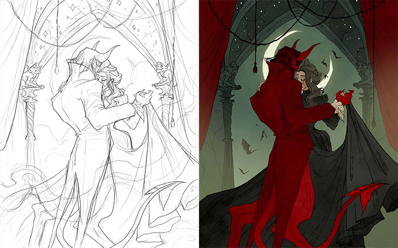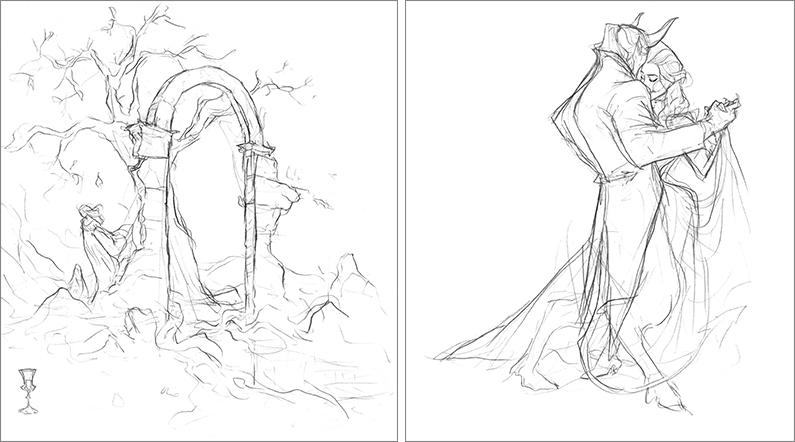 Lorsque j’arrive au stade de l’esquisse finale, je commence par tracer approximativement les personnages de la composition, puis j’affine lentement chacun des détails du costume, du visage et de l’arrière-plan. Mon style est très anguleux, ce qui contribue à l’ambiance gothique sombre de la pièce. J’aime également que la draperie ait de la présence et un poids.