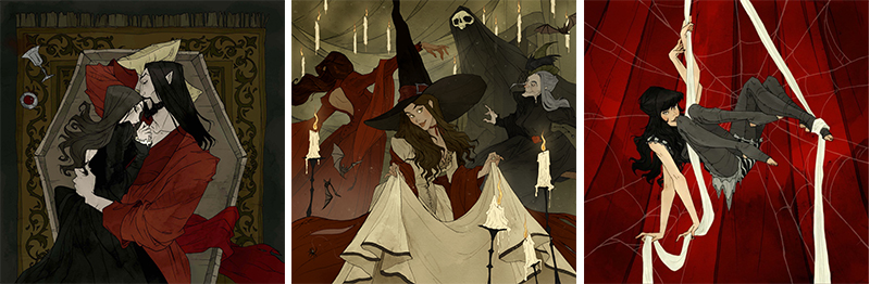 Bien que mon travail incorpore une forte influence des illustrateurs de « l’Âge d’Or » et de l’esthétique victorienne, je considère que mes illustrations font partie du genre « fantasy », car j’aime vraiment explorer les sujets surnaturels ! Des monstres, des fantômes et toutes sortes de créatures fantastiques étranges apparaissent pratiquement dans la totalité de mes œuvres. J’aime démontrer le côté humoristique ou romantique de ces personnages tout en représentant un style gothique sombre.