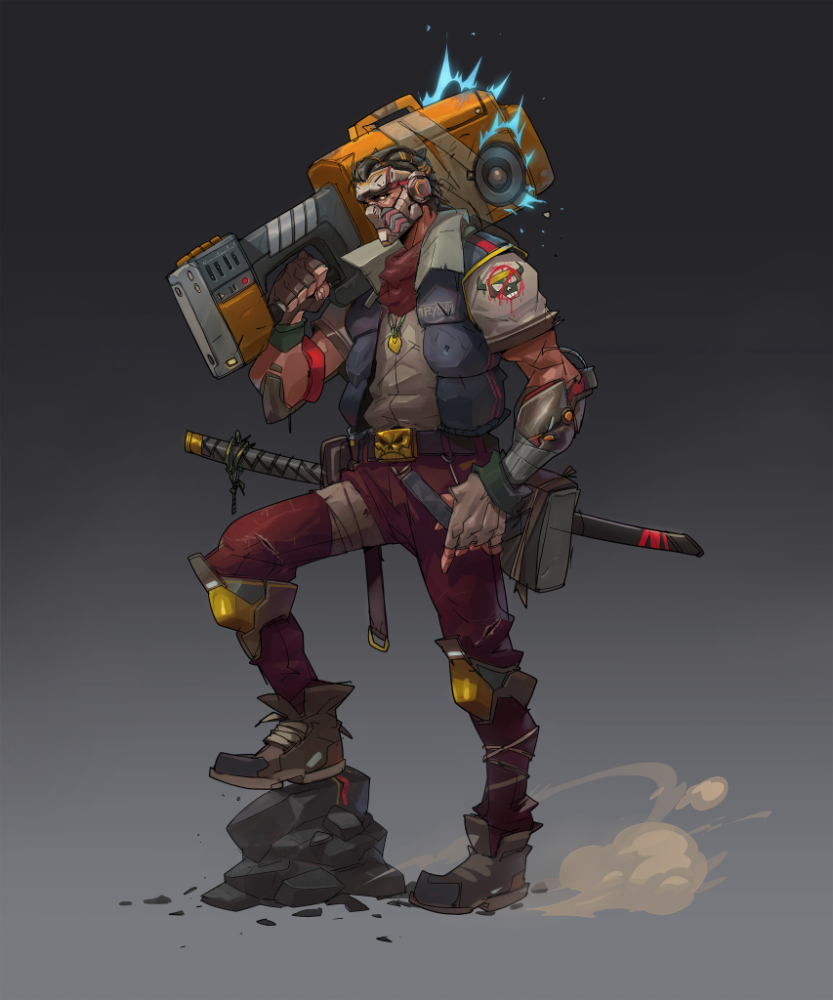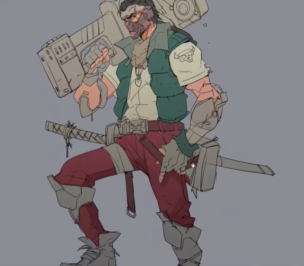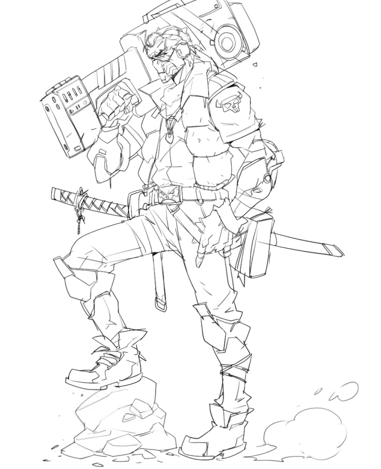 Je voulais que l’énorme arme se démarque, car c’est l’un des aspects clés de ce concept. Avoir une arme qui reflète la même attitude que celle du personnage permet de donner plus de contexte au dessin et de rendre le concept créatif cohérent.