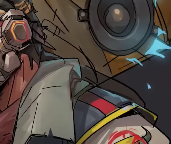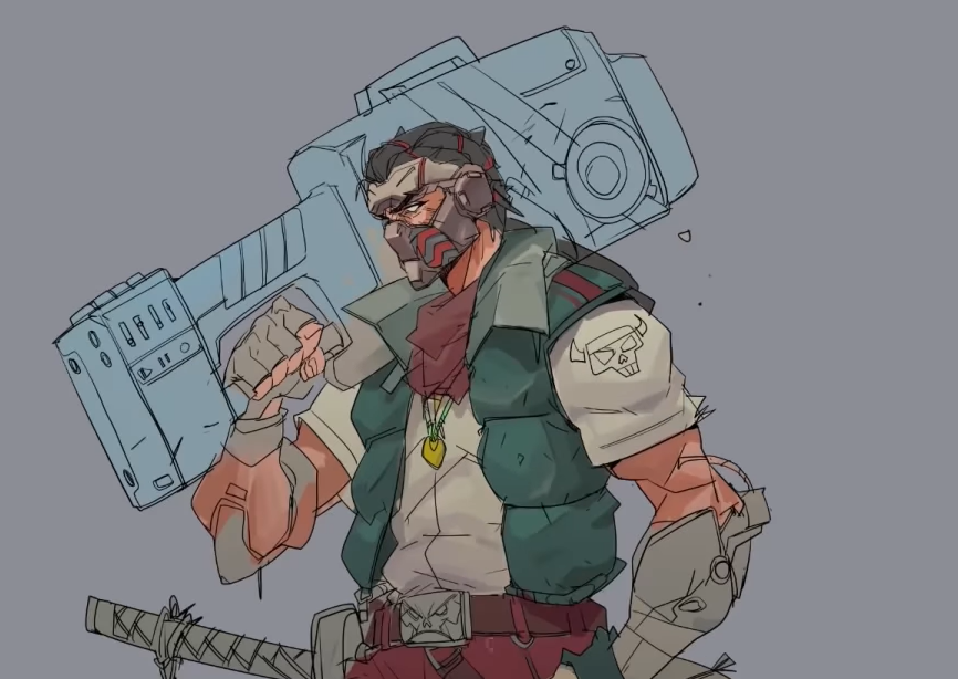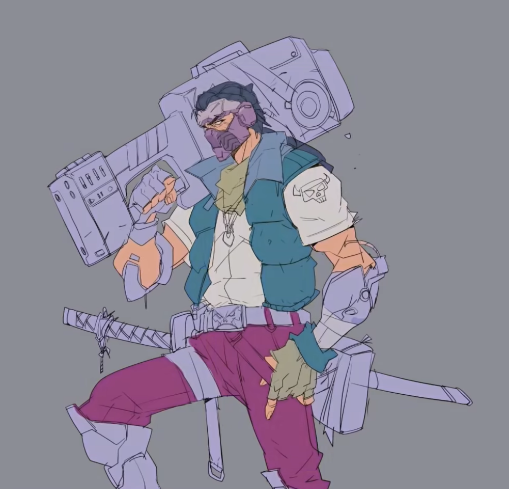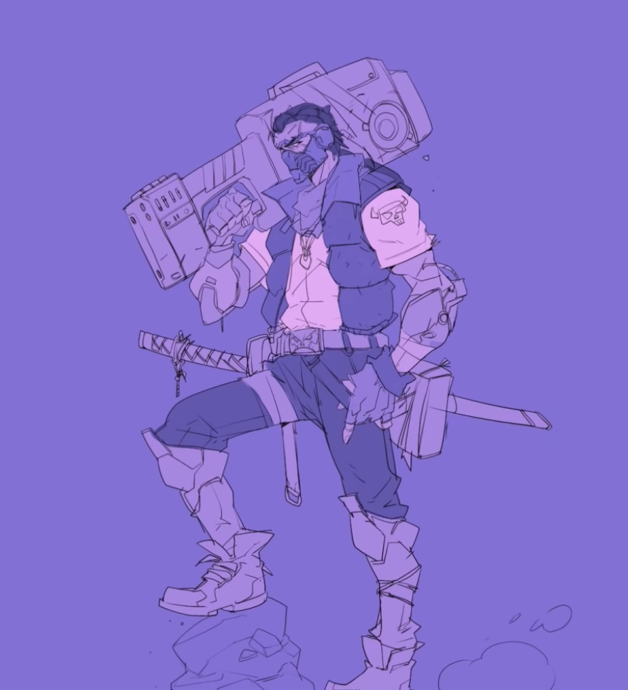 Je joue également avec des éléments différents pour incorporer une ambiance marginale, mélangeant des concepts et des éléments de cultures variés comme le katana, le crâne sur son épaule et l’énorme arme qui ressemble plus à une radio avec des haut-parleurs, influencée par l’allure des rappers. J’aime créer ce genre de personnage original en fusionnant plusieurs cultures.
