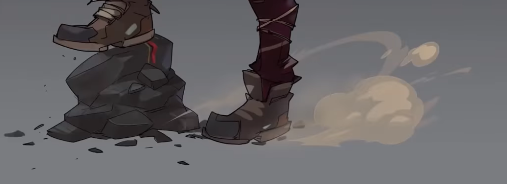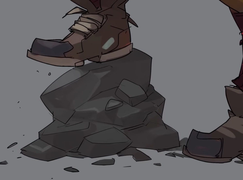 Quand je sens que j’ai réussi à obtenir un bon jeu de couleurs et ambiance, je commence à ajouter plus d’objets à la scène, comme le rocher sous son pied. Je m’assure de fondre ces éléments dans la scène de manière à ce qu’ils deviennent une partie de la silhouette.