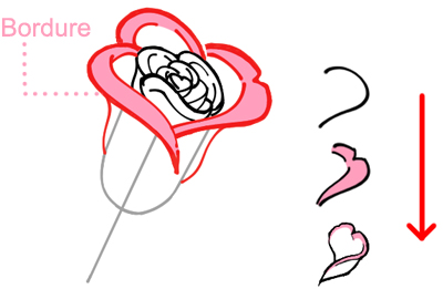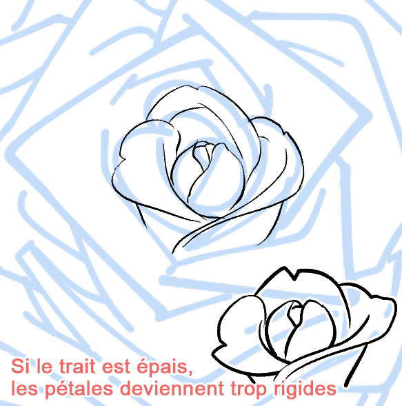 À mesure que les pétales doux et minces continuent de fleurir, ils s’enroulent progressivement. Leur représentation varie selon les illustrations ; les scènes tristes et dramatiques optent pour des pétales pointus alors que les scènes heureuses telles que les mariages utilisent des roses aux pétales ronds. C’est à vous de choisir ce qui convient le mieux selon le type de scène que vous dessinez.