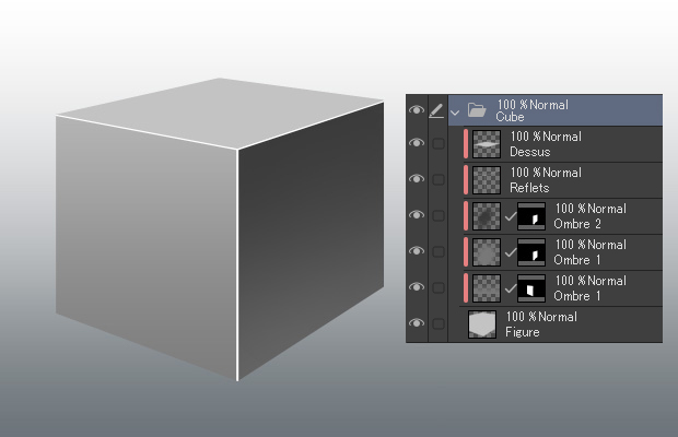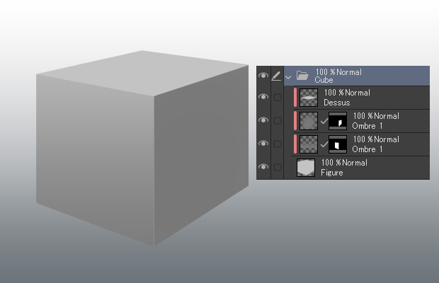 Créez un calque « Ombre 1 » pour chaque face du cube et commencez à y peindre l’ombre.