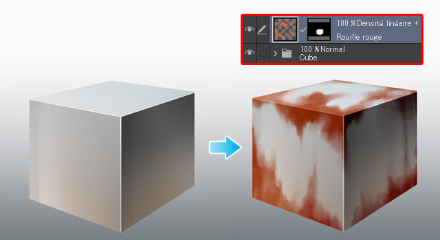 Vous pouvez l’écrêter sur le dossier du cube, mais dans le cas présent, ajoutez un masque de calque sur le dossier afin de créer un calque d’écrêtage sur le calque « Rouille rouge ».