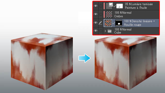 Dessinez la rouille sur le calque « Rouille rouge » et réglez le mode de combinaison du calque sur « Densité couleur + » pour faire correspondre le tout à l’ombre du cube existant.