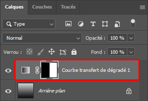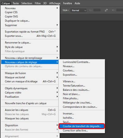 Sélectionnez le menu [Calque] > [Nouveau calque de réglage] > [Courbe de transfert de dégradé] pour créer un calque de carte de dégradé.