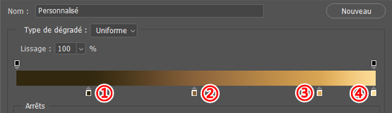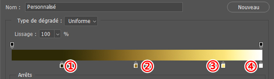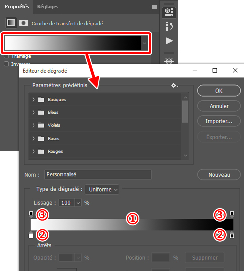 La partie ① dans [Éditeur de dégradé] est la couleur définie du dégradé.
