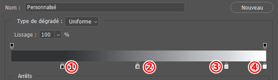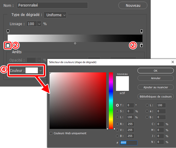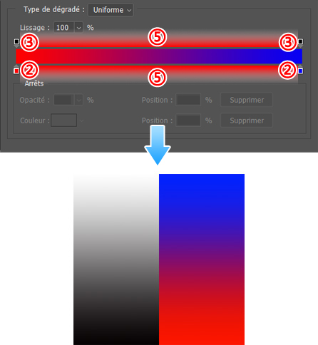 Le curseur ② définit la couleur du dégradé et le curseur ③, qui a une forme similaire, indique l’opacité de la couleur.