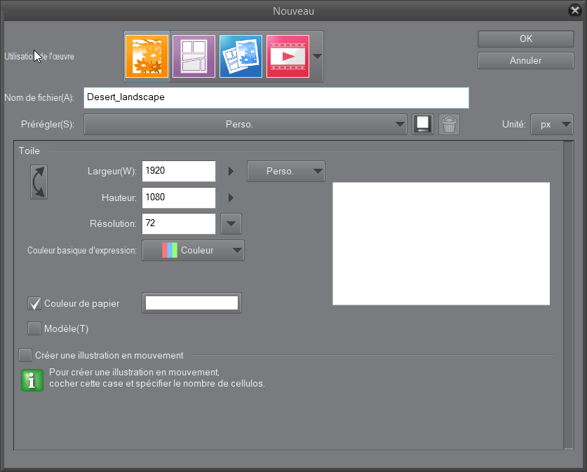 Pour ce tutoriel, j’utilise un format full HD (1920×1080). Attention à bien conserver une résolution de 72 ppp (pixels par pouce).