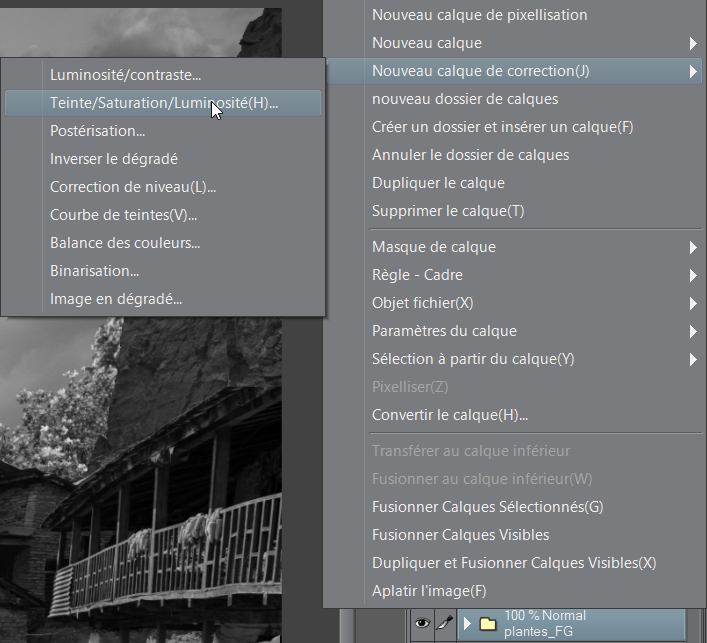 Mon document étant bien organisé, je n’ai qu’à sélectionner le groupe Plantes positionné au premier plan, puis appliquer la fonction Teinte/Saturation/Luminosité.