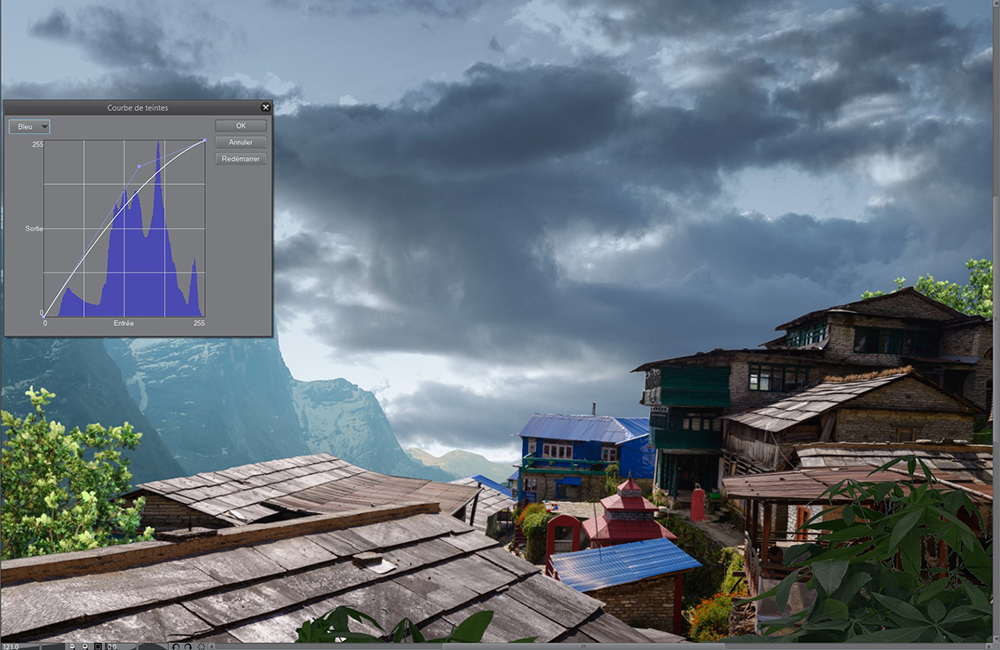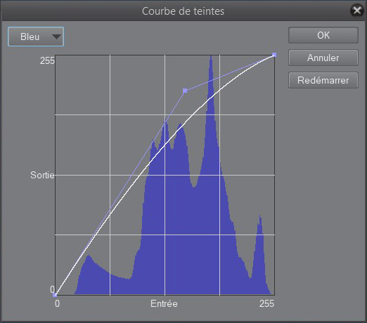 Ensuite, j’applique une Courbe de teintes dans laquelle je modifie les canaux RVB les uns après les autres afin d’augmenter la teinte bleutée de l’image.