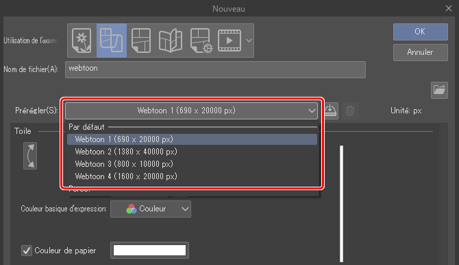 Dans la boîte de dialogue [Nouveau], sélectionnez [Webtoon] dans [Projet] pour afficher les paramètres de création d’une toile webtoon.
