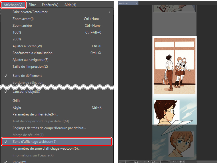 Activez le menu [Affichage] > [Webtoon] pour vérifier à quoi ressemble une partie de la toile sur l’écran d’un smartphone.